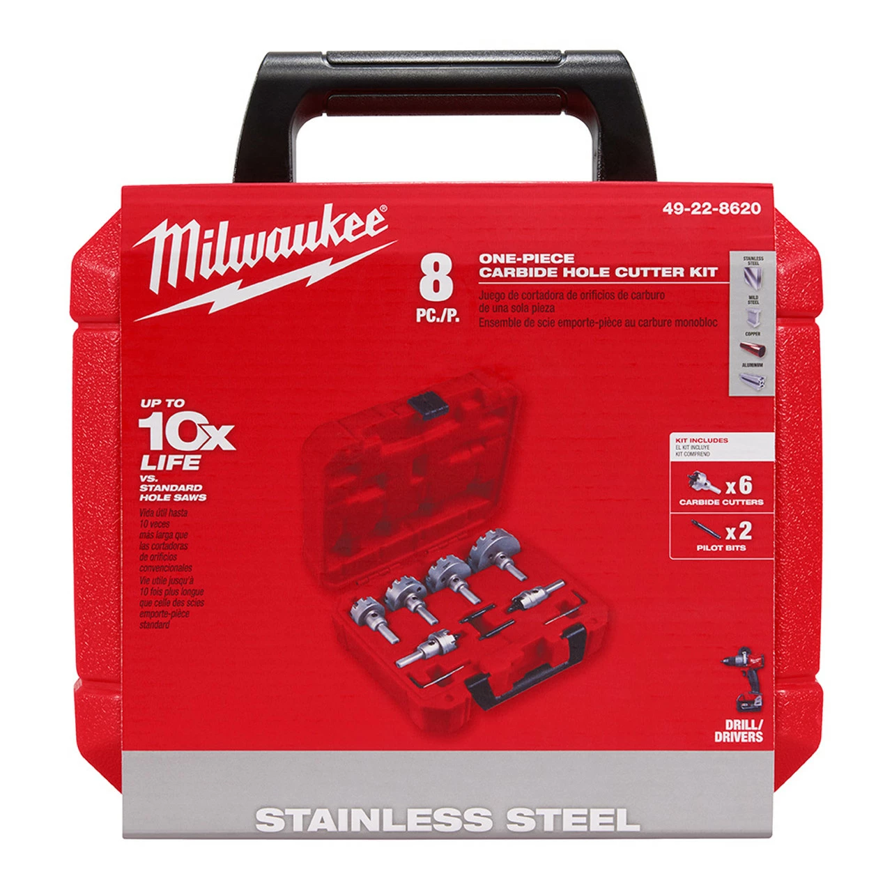 Our One-Piece Carbide Cutter 8-Piece Set features carbide teeth for longer life and smooth cuts in stainless steel and other hard metals. Each cutter features a stop shoulder design that prevents over-drilling and limits cuts to a 3/16 in. depth, while a 3-flat shank optimizes each cutter drill bit for use in Drill/Drivers. The spring-loaded pilot bit provides complete plug ejection for clean, efficient cutting of each hole. Their solid one-piece design of each hole cutter delivers you added durability and dependability cut after cut. This Milwaukee carbide hole cutter kit includes 7/8, 1-1/8, 1-3/8, 1-3/4, 2, 2-1/2 in. cutters, and two pilot bits.